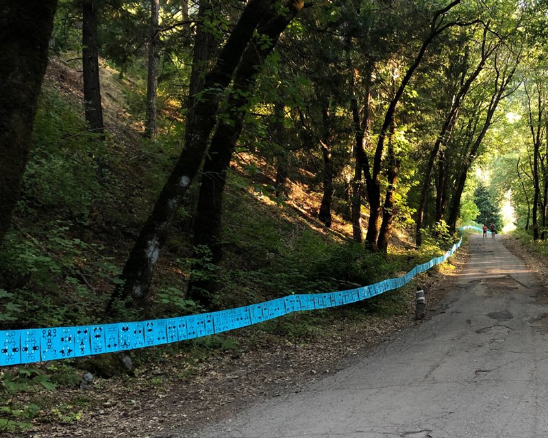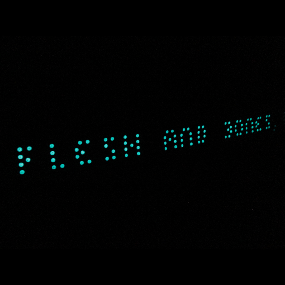 A site-specific installation nearly 600 ft long, The Lichtoglyphs lured event attendees down a long road into the woods to decipher the strange glyphs which could only be read in darkness. Laser-printed sheets of card stock, one glyph per page, were hand painted with special glow-in-the-dark paint and individually hung on wire.