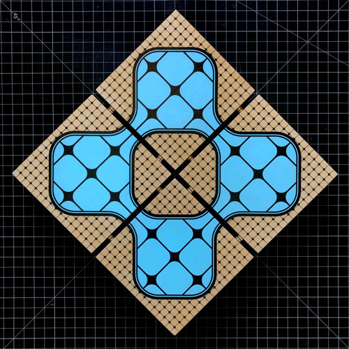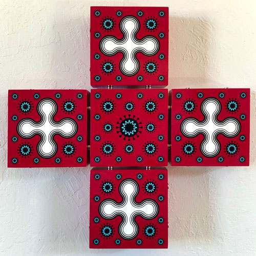 Forces of attraction...interdependencies...pieces that join together to create a greater whole--they're subjects I work with over and over, testing different ways to express it. My journey with modular art began with wanting to join small panels together to form polyptychs of interchangeable pieces that could be reconfigured according to a pattern. I eventually came up with a way to use neodymium magnets, which sparked a fascination with the subject of polarities and electricity. That lead to exploring the interactions of various elementary particles and molecules and the metaphors for human relationships they brought to mind.
