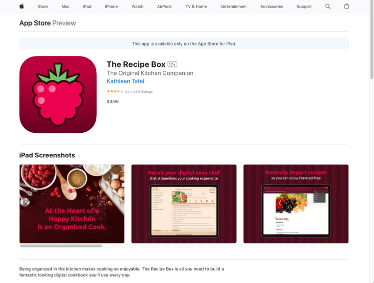 The Recipe Box for iPad is a recipe manager that positioned in the top ten list of its category for over 6 years, peaking at the #1 app in its category, and reached as high as #50 overall.
