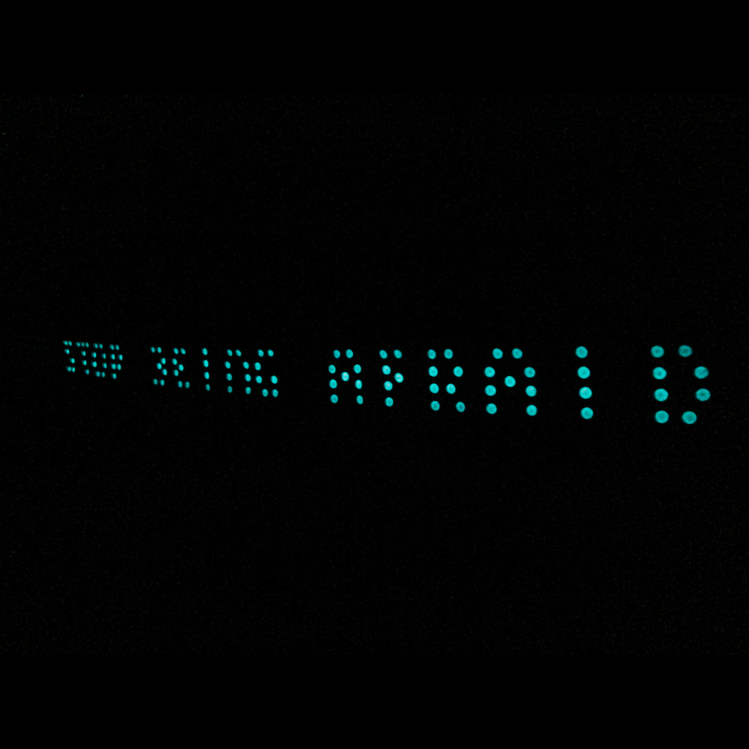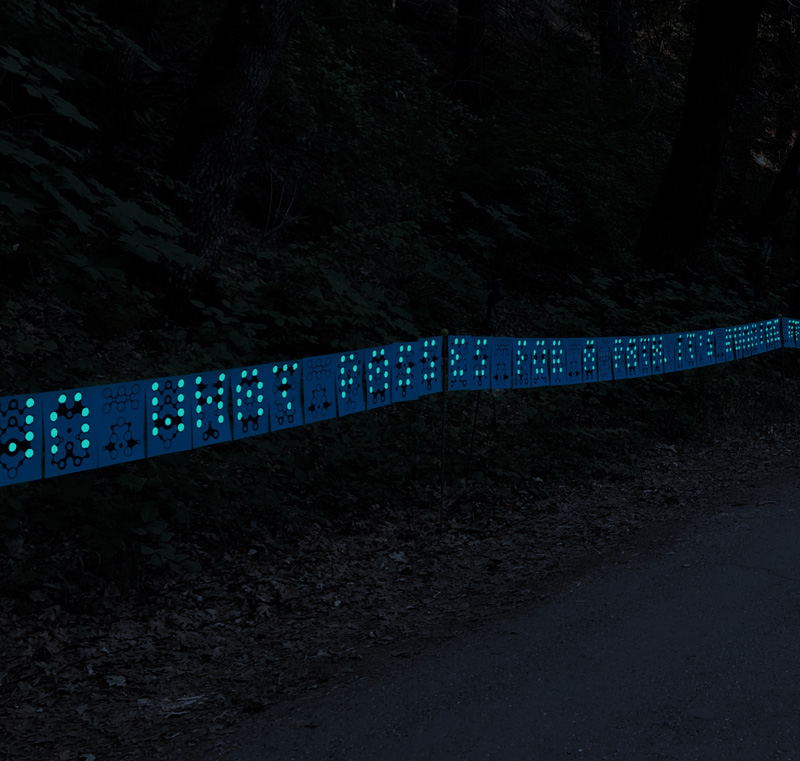 A site-specific installation nearly 600 ft long, The Lichtoglyphs lured event attendees down a long road into the woods to decipher the strange glyphs which could only be read in darkness. Laser-printed sheets of card stock, one glyph per page, were hand painted with special glow-in-the-dark paint and individually hung on wire.