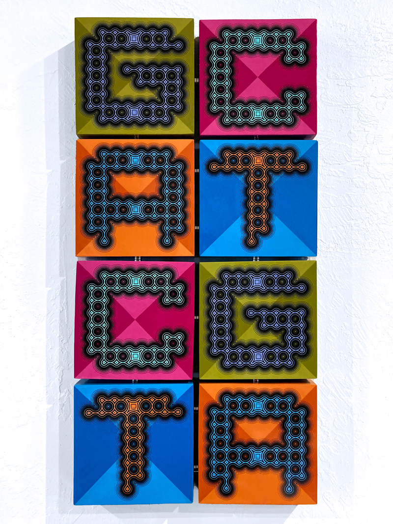 Forces of attraction...interdependencies...pieces that join together to create a greater whole--they're subjects I work with over and over, testing different ways to express it. My journey with modular art began with wanting to join small panels together to form polyptychs of interchangeable pieces that could be reconfigured according to a pattern. I eventually came up with a way to use neodymium magnets, which sparked a fascination with the subject of polarities and electricity. That lead to exploring the interactions of various elementary particles and molecules and the metaphors for human relationships they brought to mind.